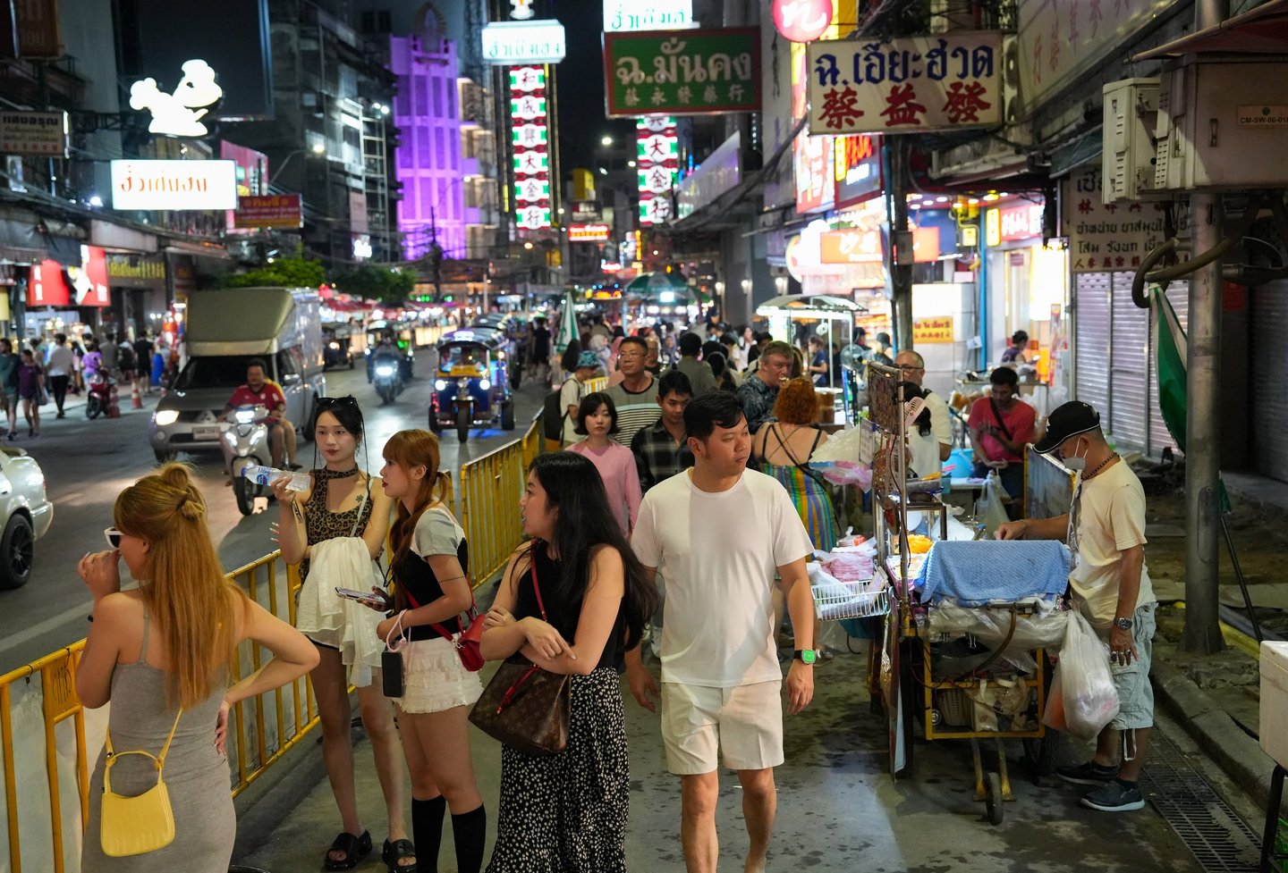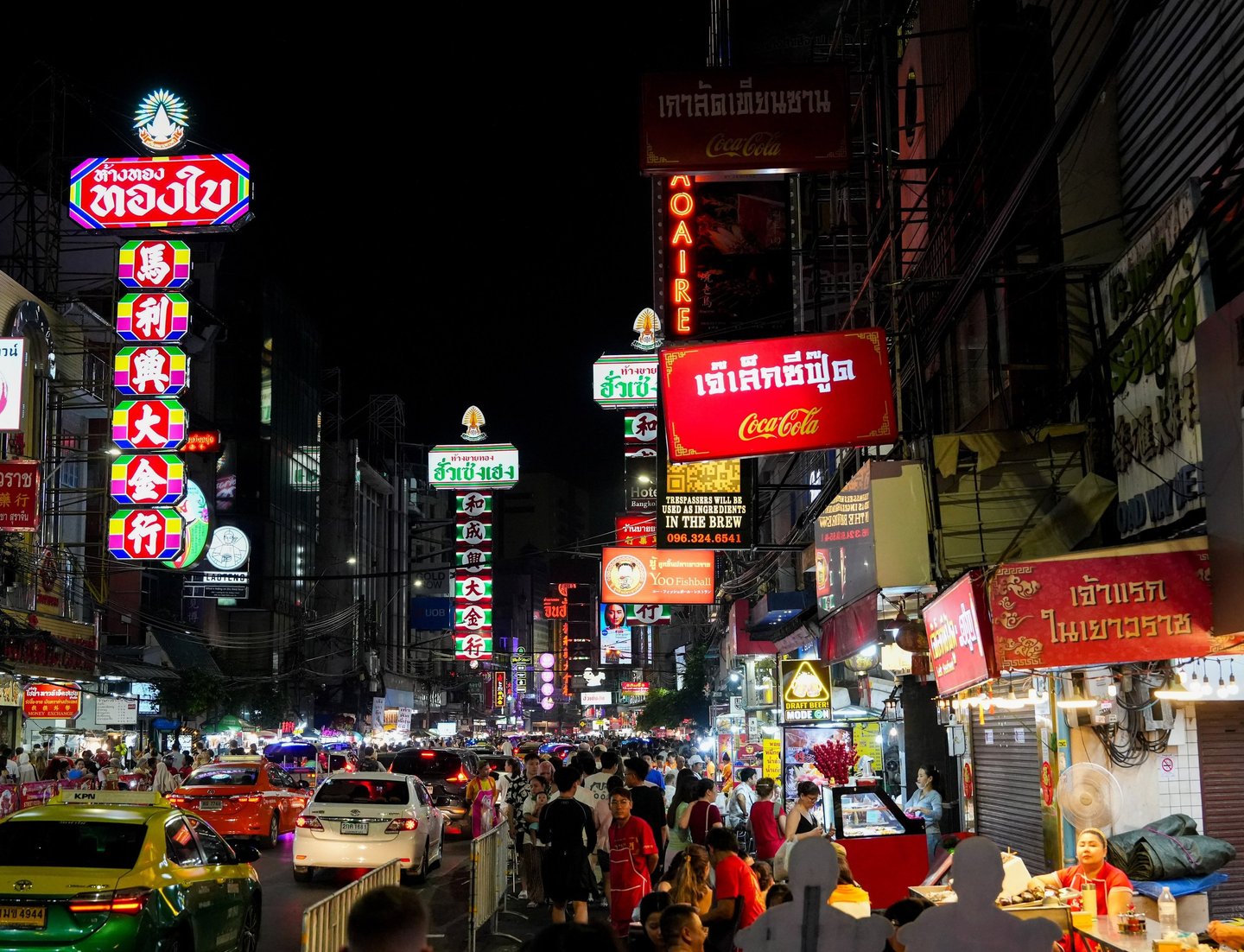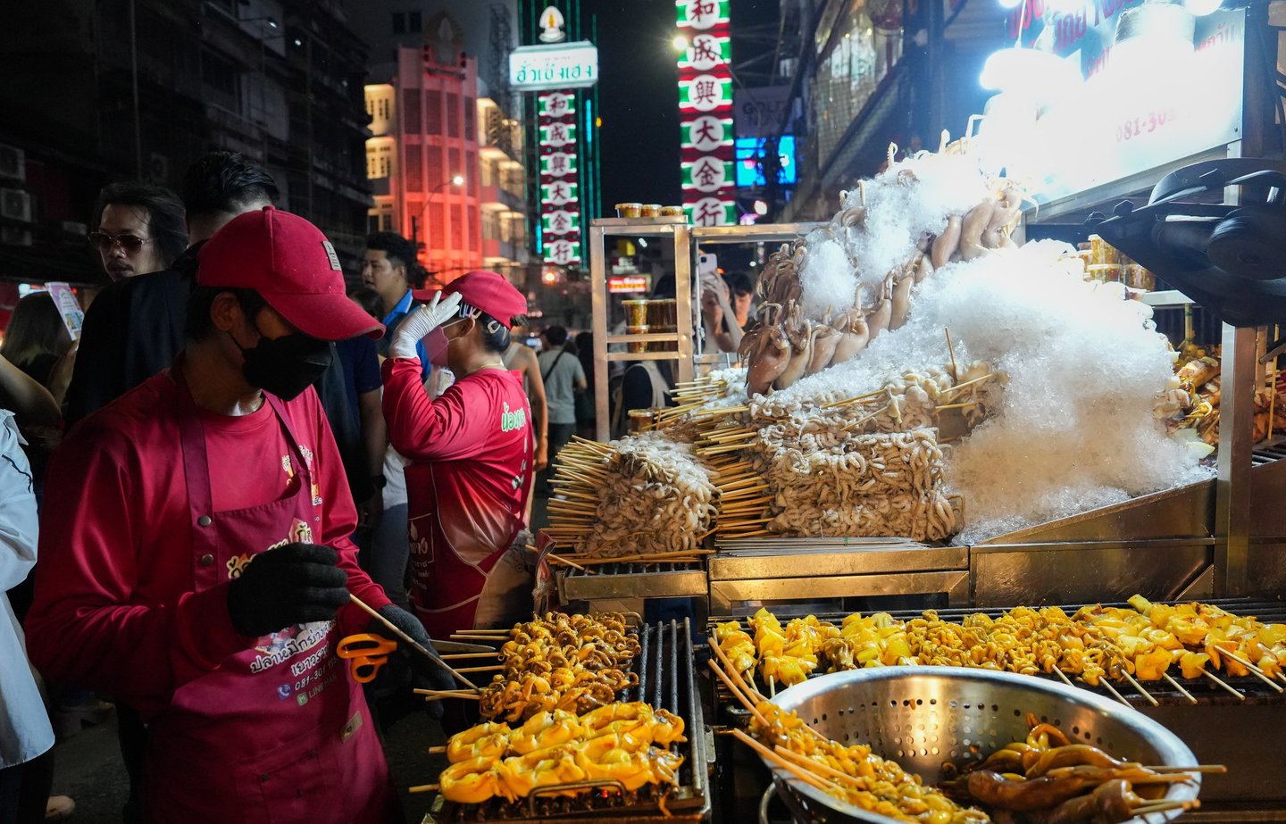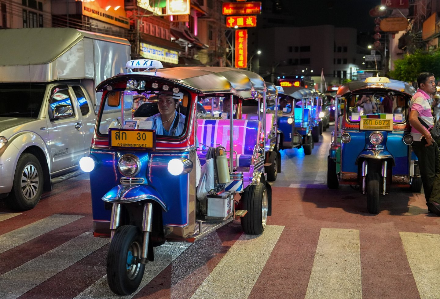Along Yaowarat Road you’ll also see countless tuk-tuk taxis waiting for passengers, their colorful lights blending into the neon glow of the street.
