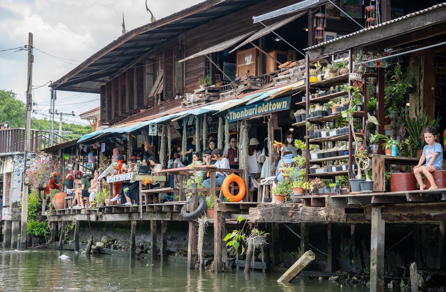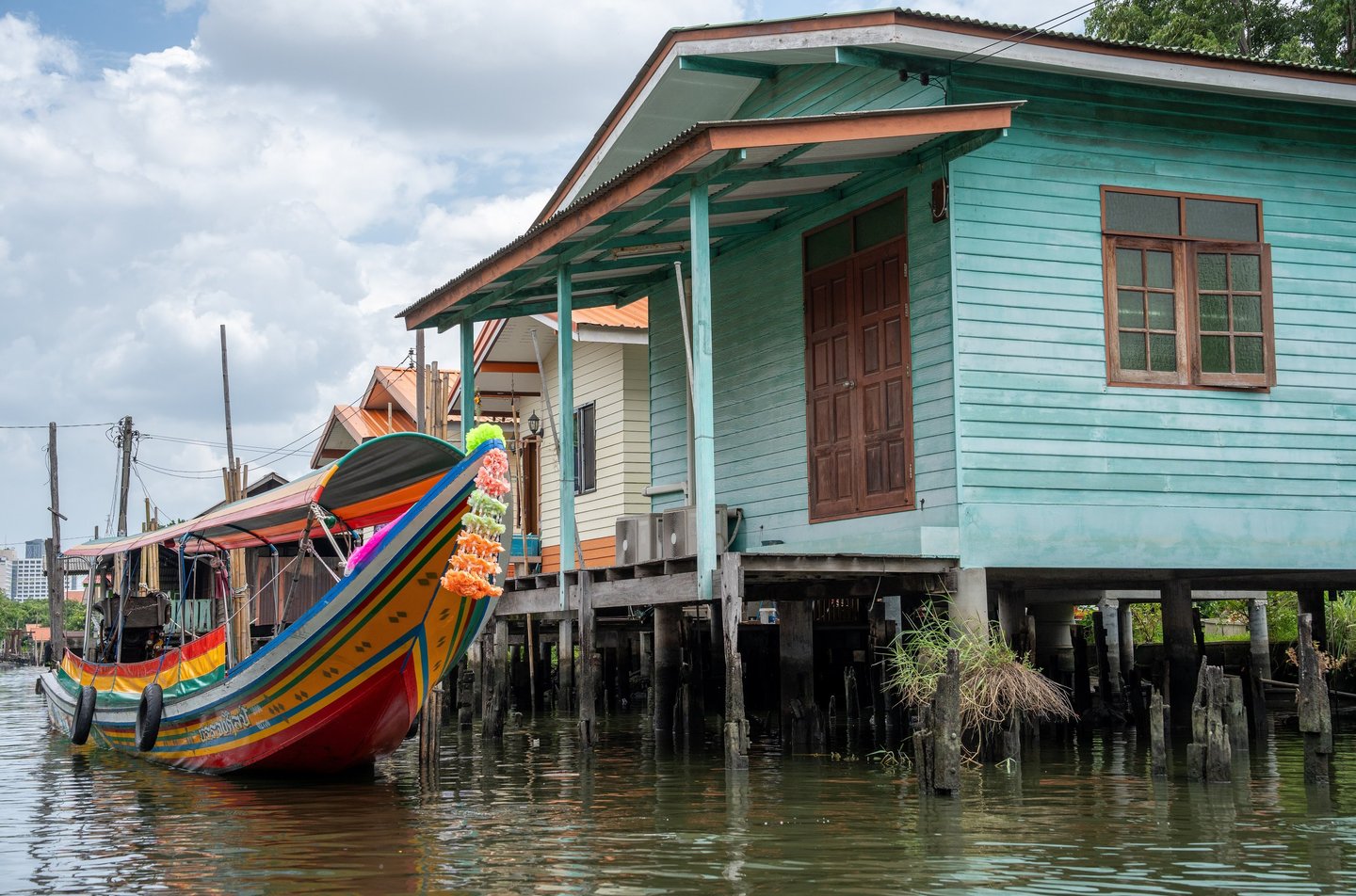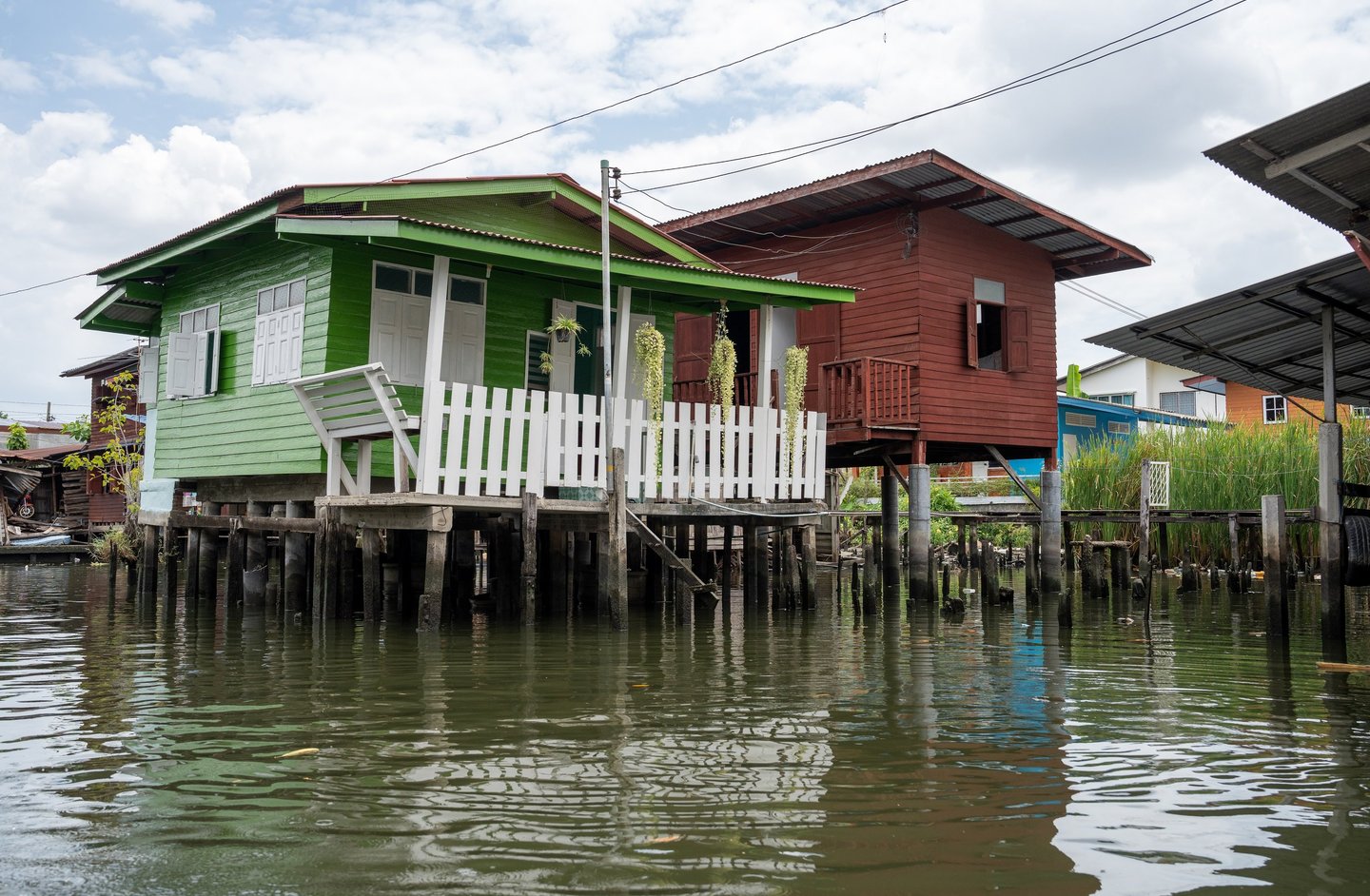 Wooden houses stand directly on the water, many built on stilts, with small docks where boats are tied up. Some of these homes have been here for decades, weathered by sun and rain, while others have been adapted into small restaurants, cafés, or bars overlooking the canal.