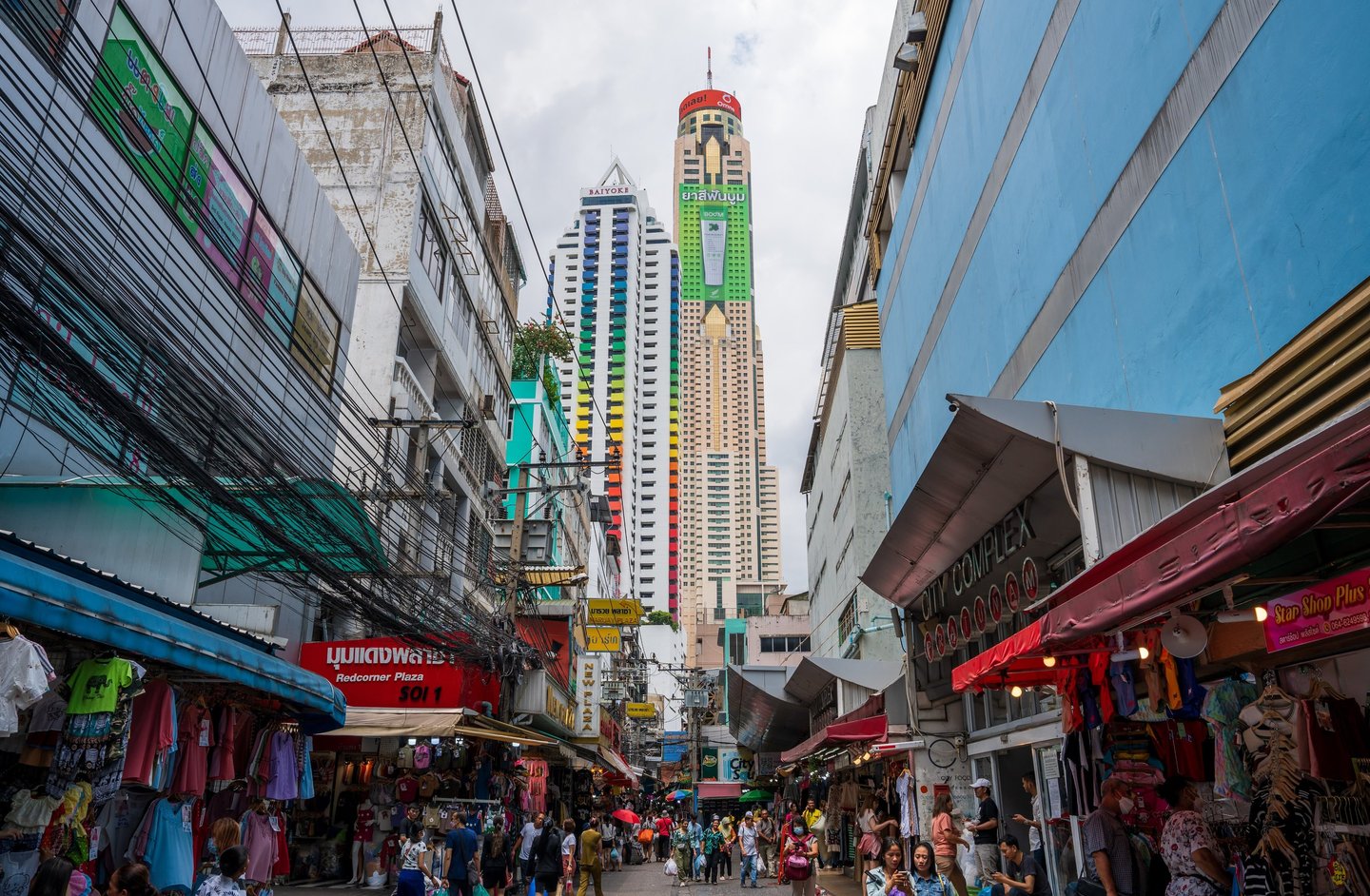 On the opposite side stands the City Complex Pratunam, another busy shopping center that adds to the density and intensity of the area.