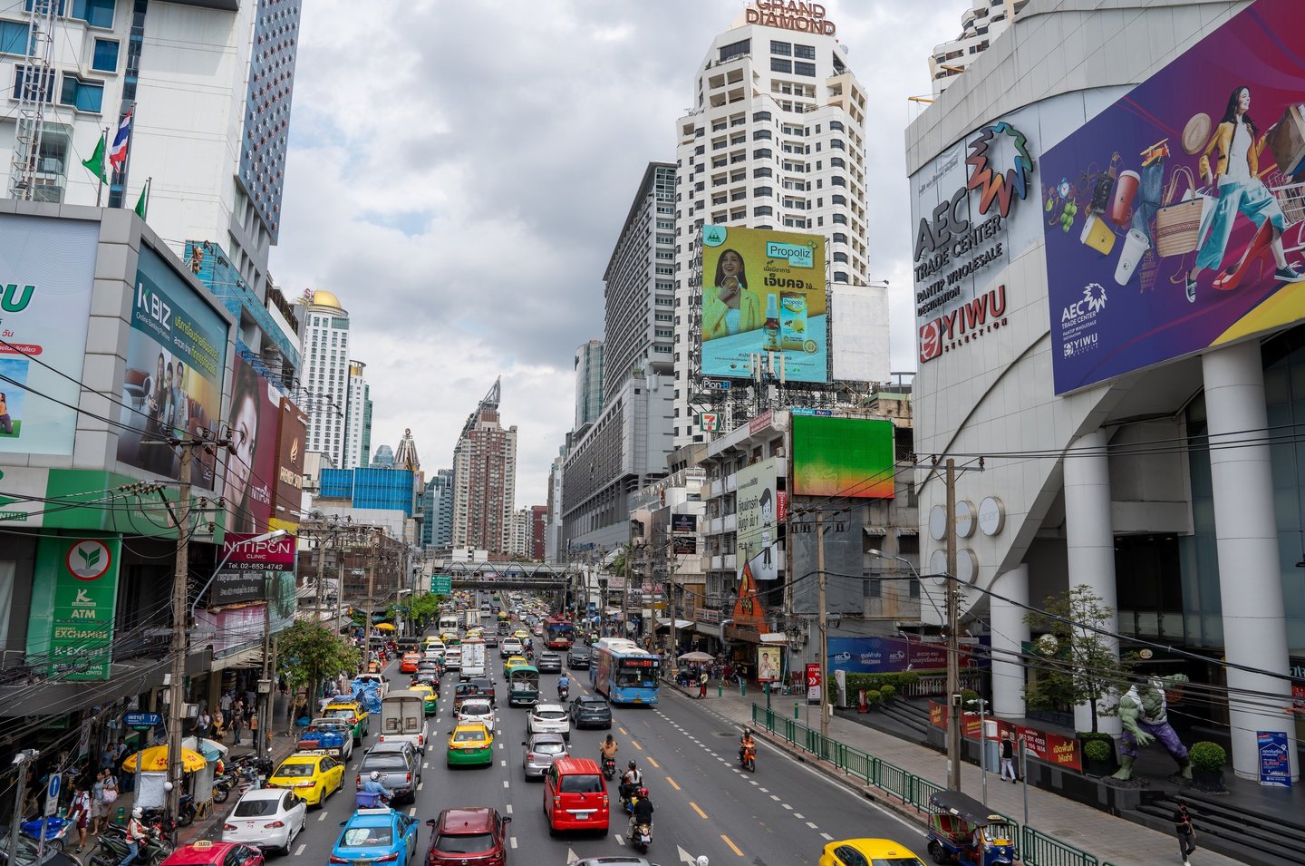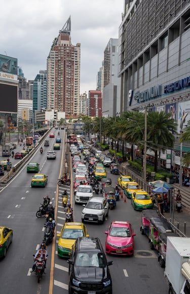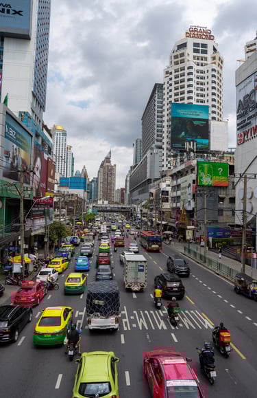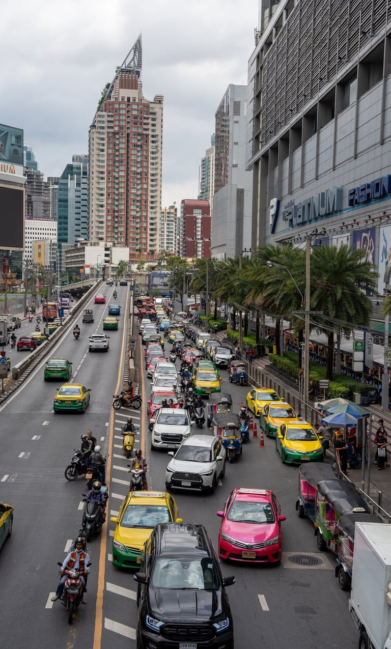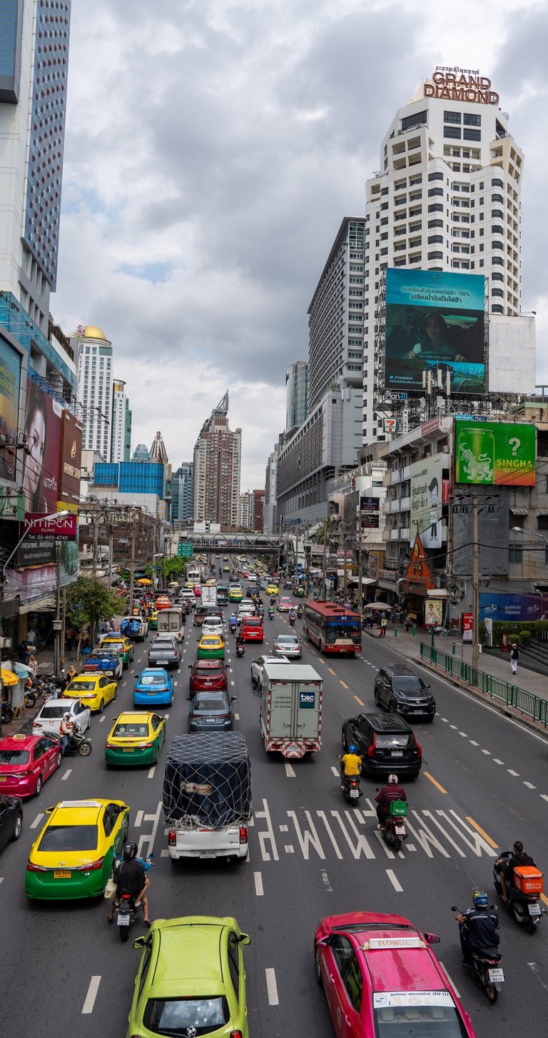 Walking through Pratunam, you are constantly surrounded by movement. Delivery trucks, taxis, motorbikes, and pedestrians all compete for space. Above that, large buildings and shopping centers dominate the skyline.