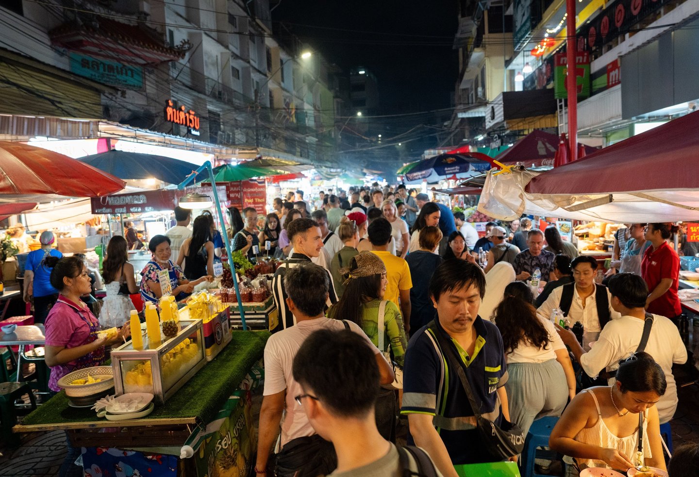 Neon signs in bright Chinese characters light up the street. Restaurants open their doors and the sidewalks fill with food stalls offering everything from seafood and noodles to desserts and tropical fruit. The density of people here is remarkable. Locals, travelers, and night photographers all move through the same narrow spaces, creating an atmosphere that feels chaotic yet strangely organized.