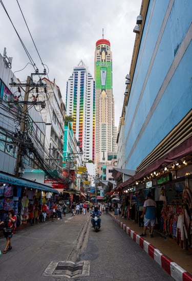 Standing in the streets of Pratunam, looking up at the tower, you get a completely different impression. The building rises out of a tightly packed urban environment filled with traffic, street vendors, and endless movement. It’s a contrast that works extremely well in urban and documentary photography.
