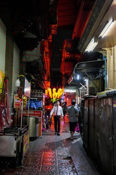 In one darker back alley behind a restaurant, I photographed a scene that could easily have come from a film noir moment — a sharply dressed Asian man in a white shirt and tie standing in the shadows, giving the impression that some kind of quiet deal was taking place.