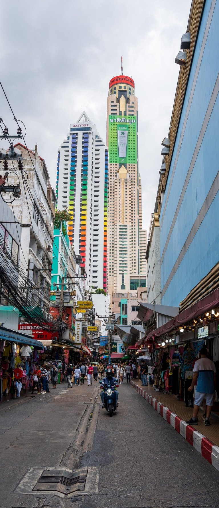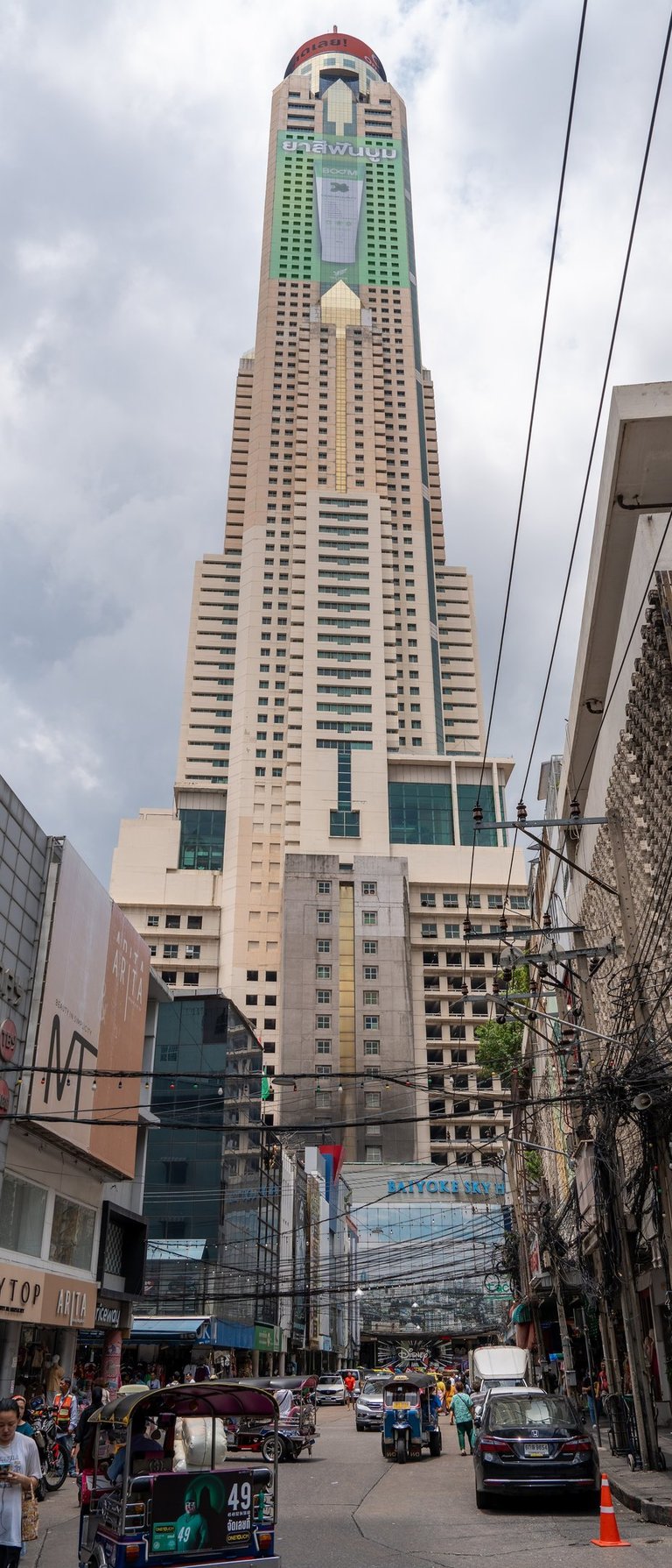 Photographed from the crowded streets of the Pratunam area, the tower feels less like a distant landmark and more like a vertical extension of the chaos happening below.