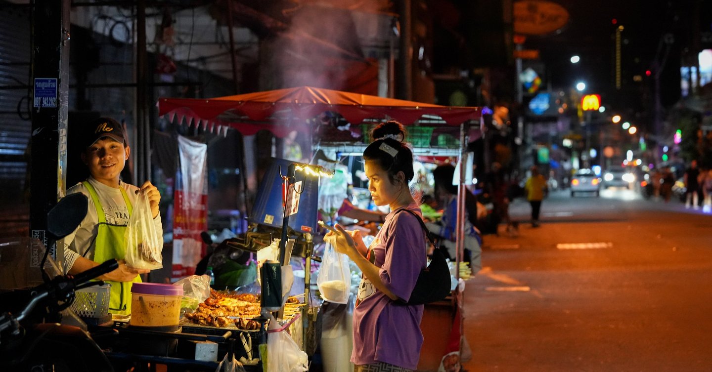 Some Thai street food stalls are still open, serving soup, noodles, or grilled chicken to the last visitors of the night
