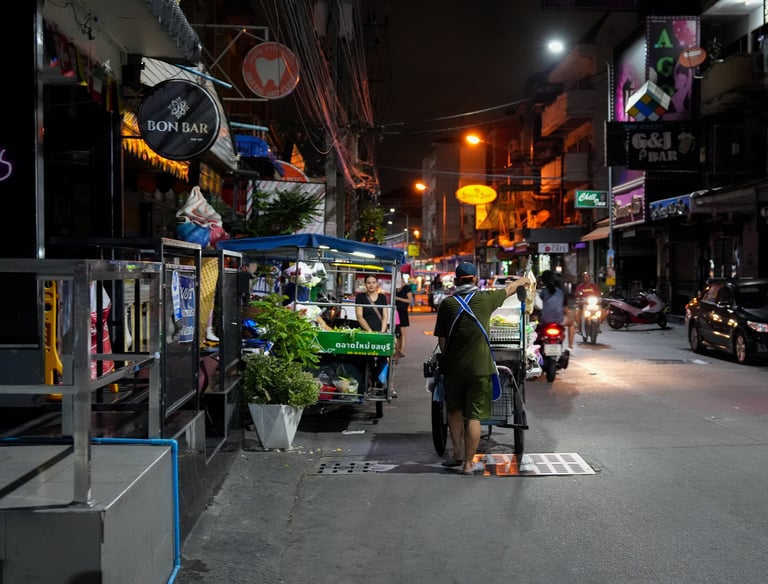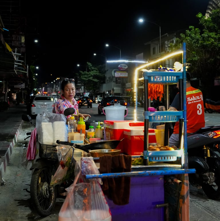 Explore Pattaya’s Soi 7 and Soi 8 before dawn – nightlife fades, street food vendors linger, and the real street life appears through my lens.