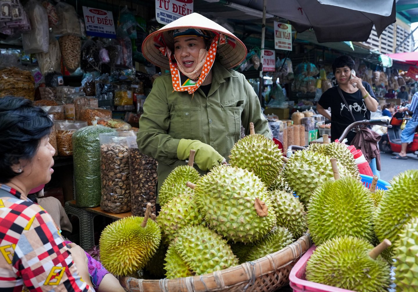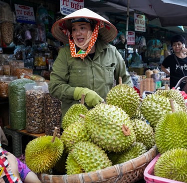 A market woman sells durian, the infamous “stinky fruit.”