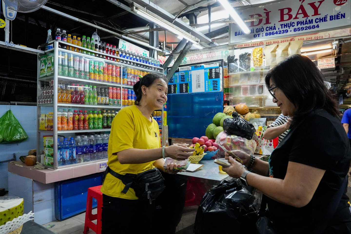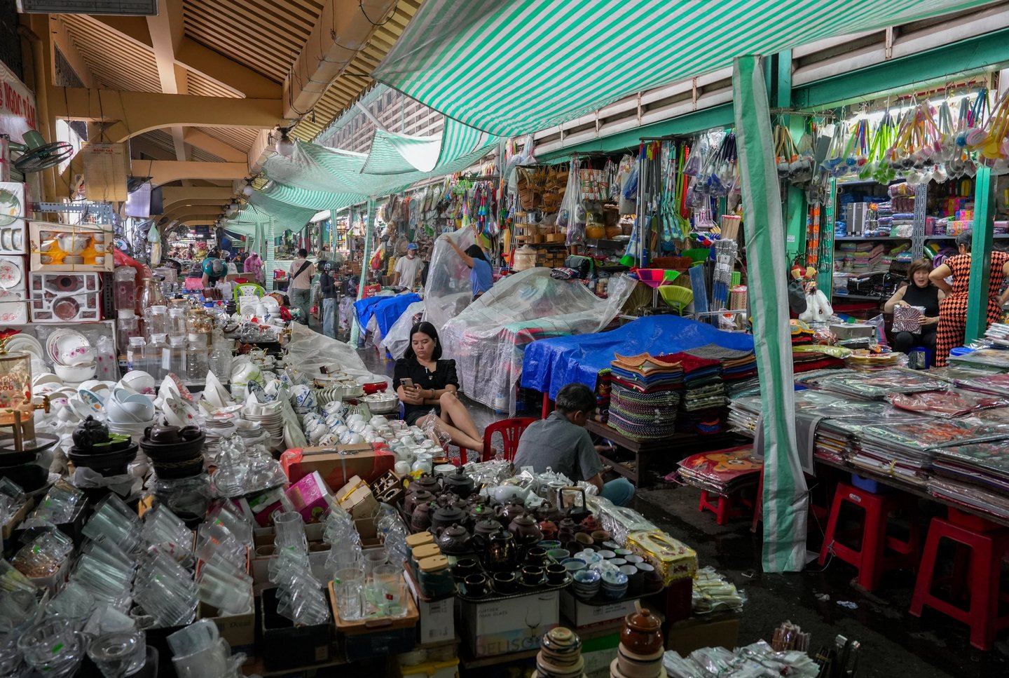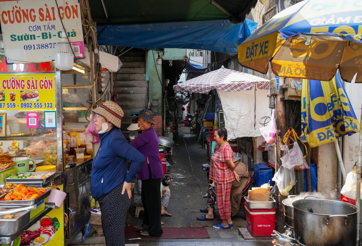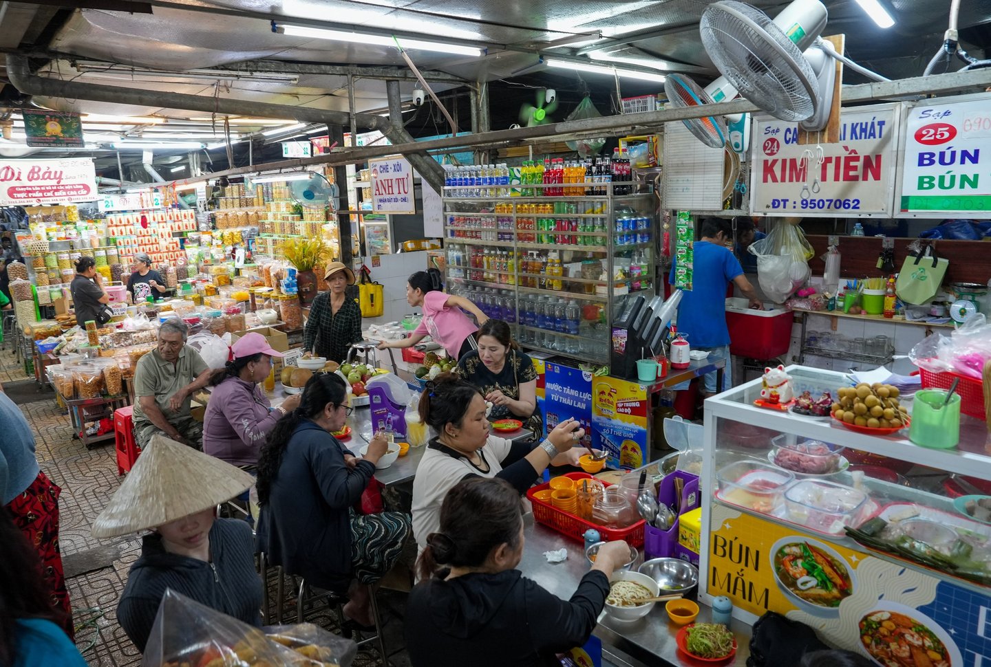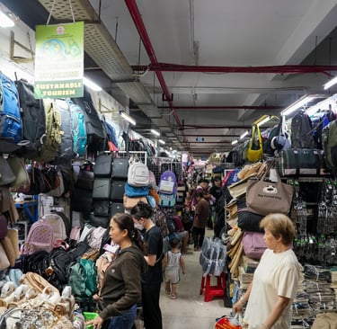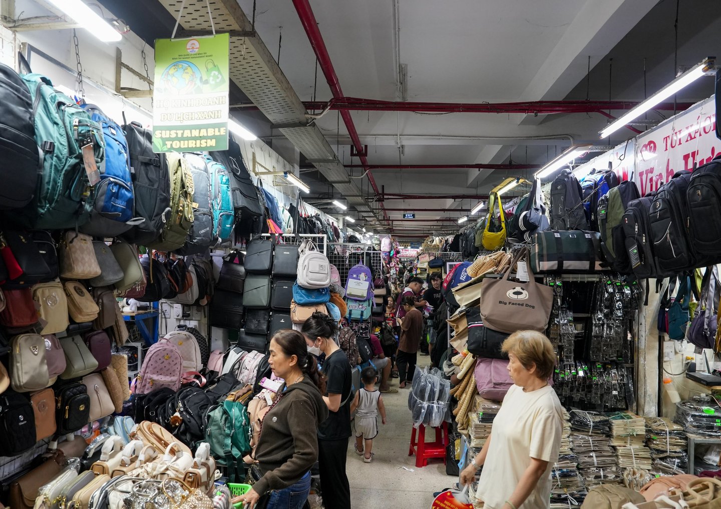 Traditional Vietnamese noodle soup (Pho) is being cooked and served right in the market aisles. One narrow alley is lined entirely with handbag stalls, and visitors have to squeeze through carefully to avoid knocking anything over.