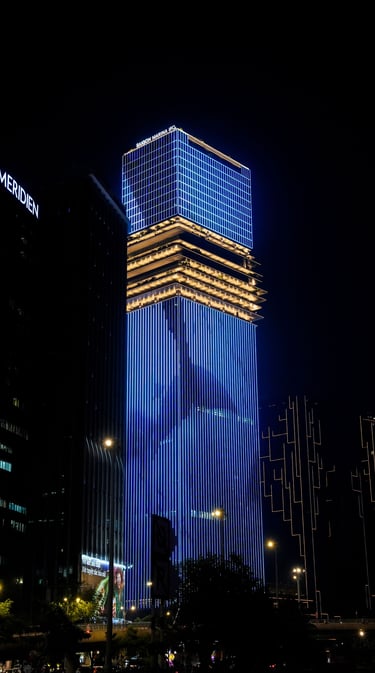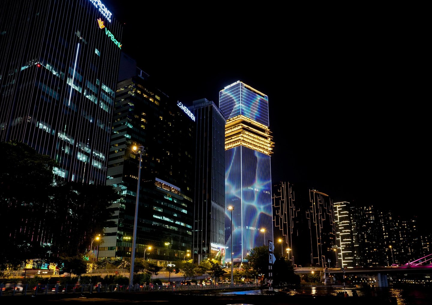 The first photos shows the Marina Central Tower in Ho Chi Minh City, Vietnam, illuminated at night.