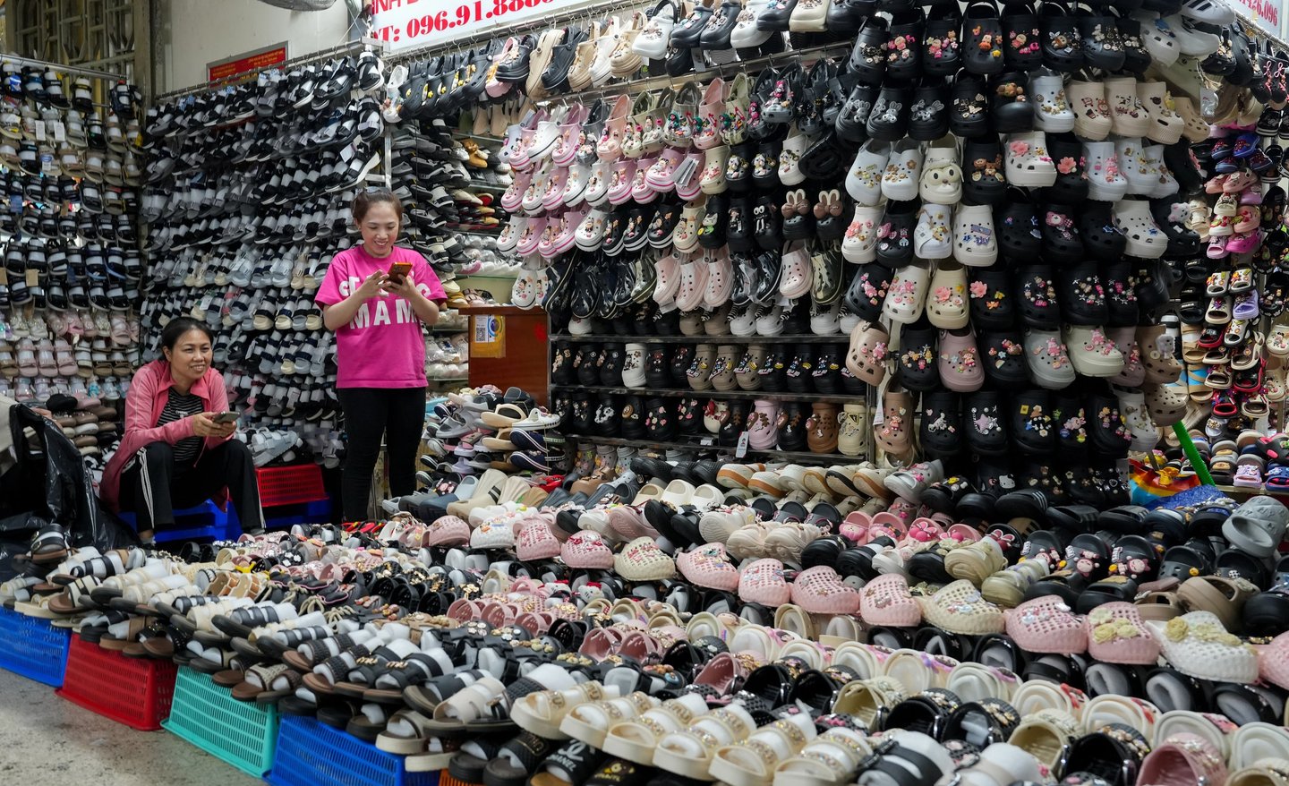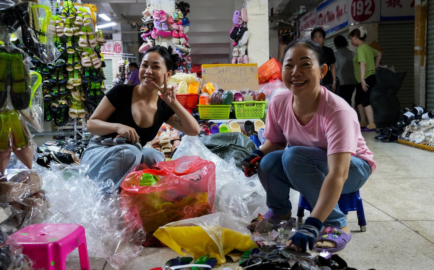 Two cheerful women sit on the ground, surrounded by mountains of shoes — and you can’t help but wonder, who will buy all of these