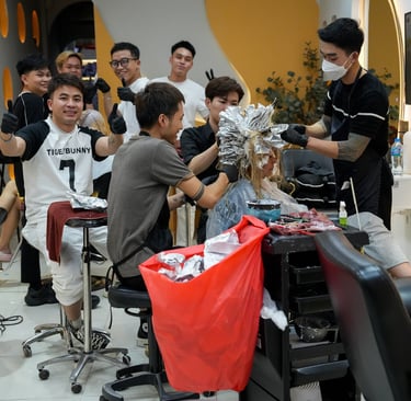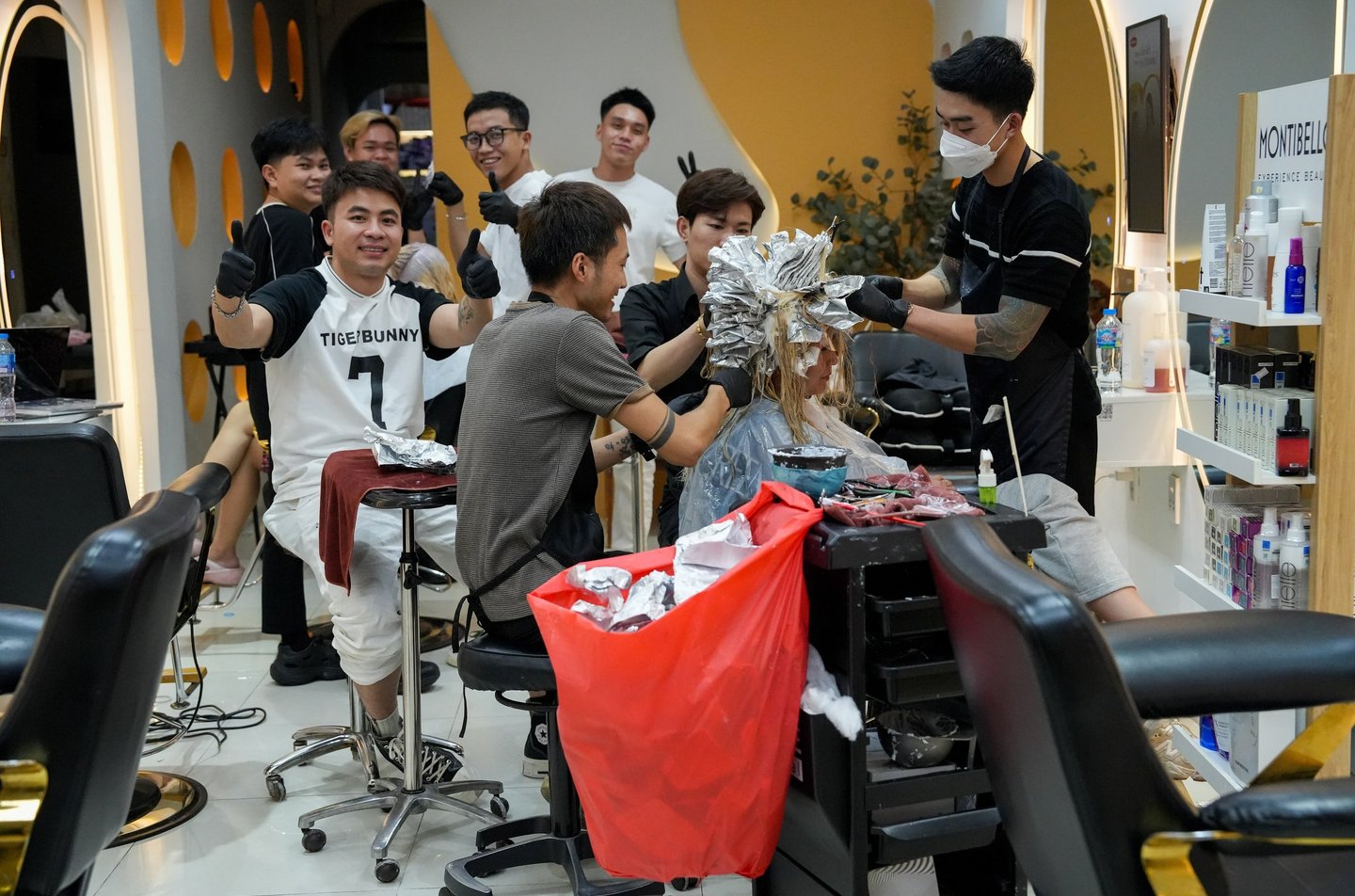 Behind them, there’s an aquarium shop, followed by a beauty salon where a group of men are busy styling a woman’s hair.