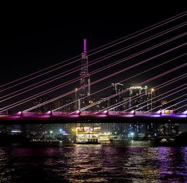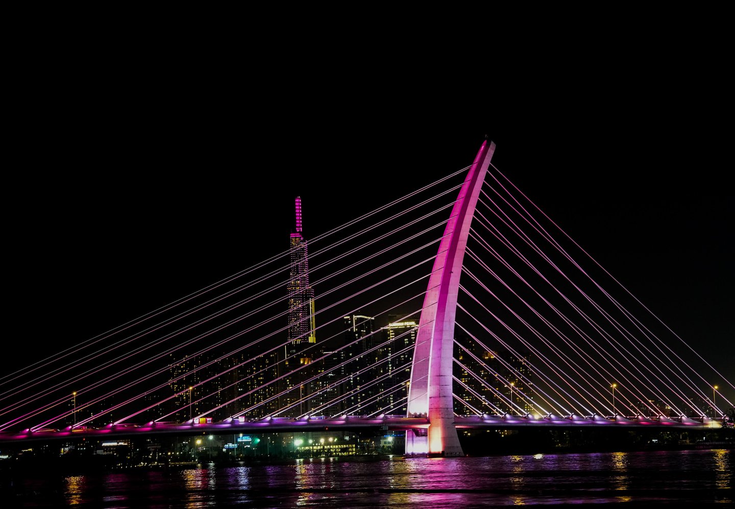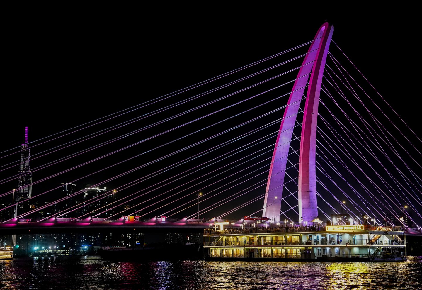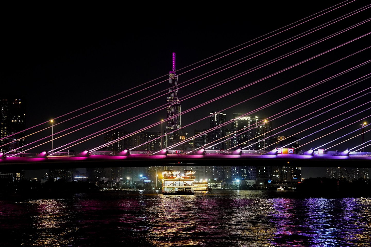 This modern cable-stayed bridge glows in bright purple light and stretches across the Saigon River.