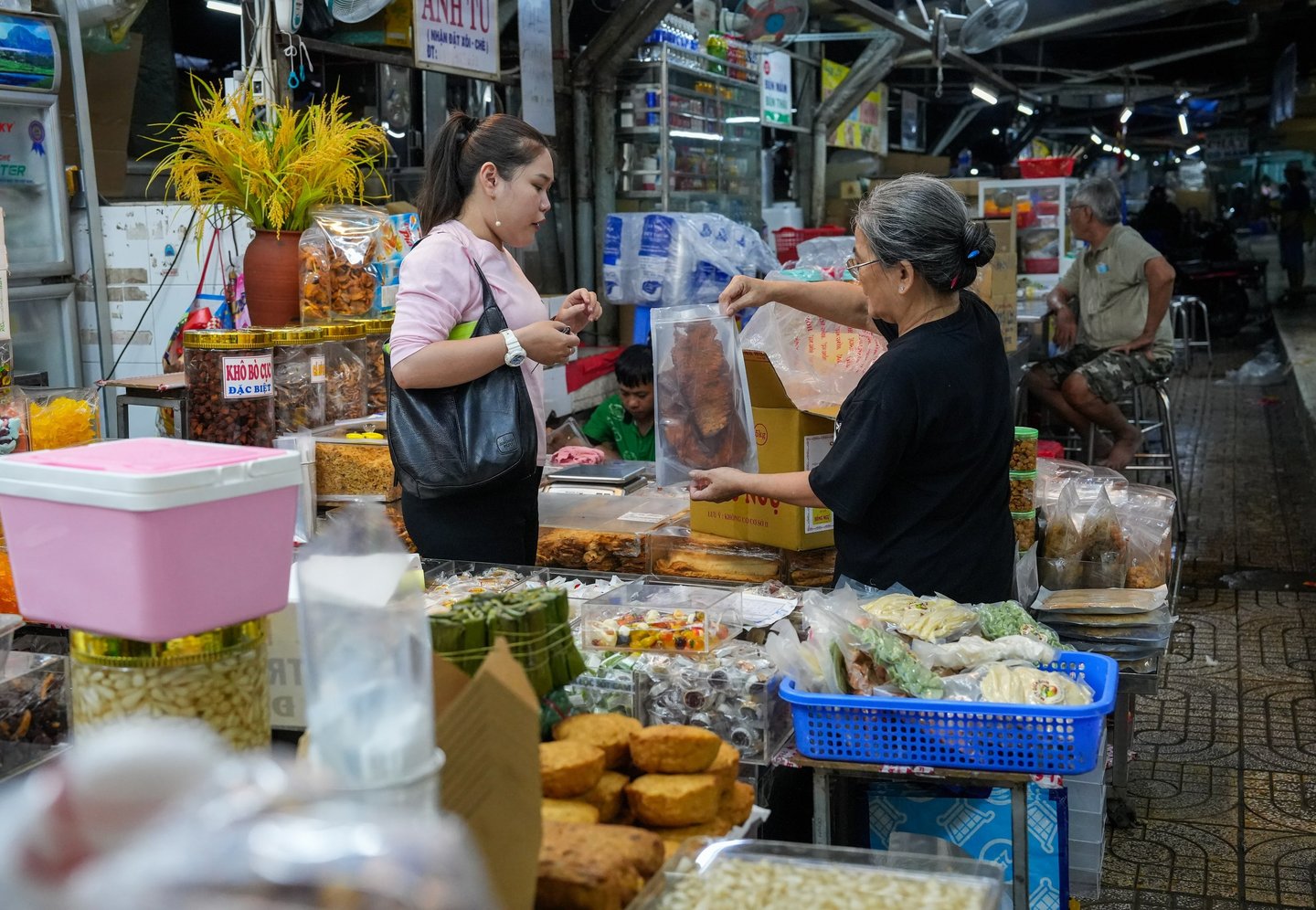 A vendor sits surrounded by piles of colorful sweets, while another woman samples her own freshly cooked food.