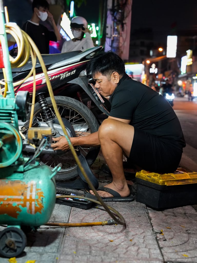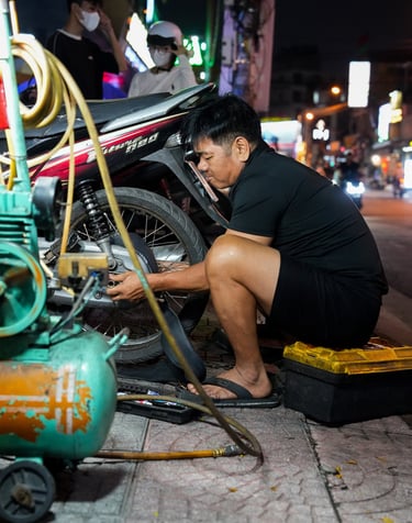 A Vietnamese mechanic repairs a scooter directly on the pavement, while just two meters away an elderly woman sits on a small stool watching him work.