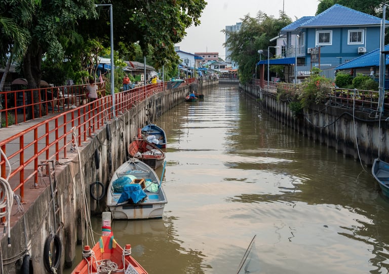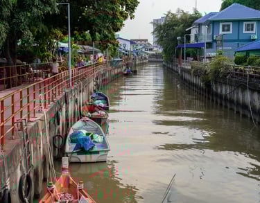 In this small alley along the Khlong Nok Yang, I captured moments of real Thai life — people starting their day, motorbikes passing through narrow paths, and reflections of the wooden stilt houses in the calm water.