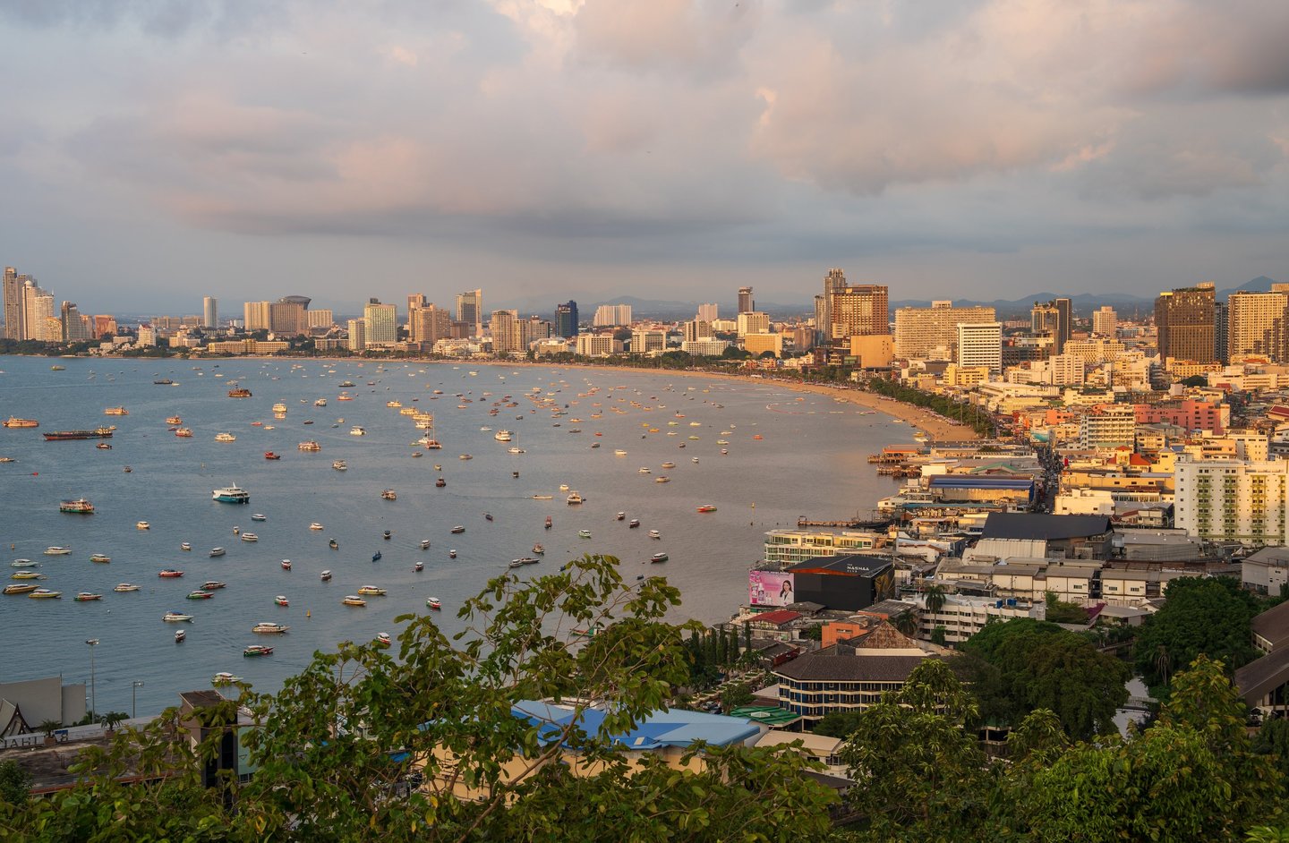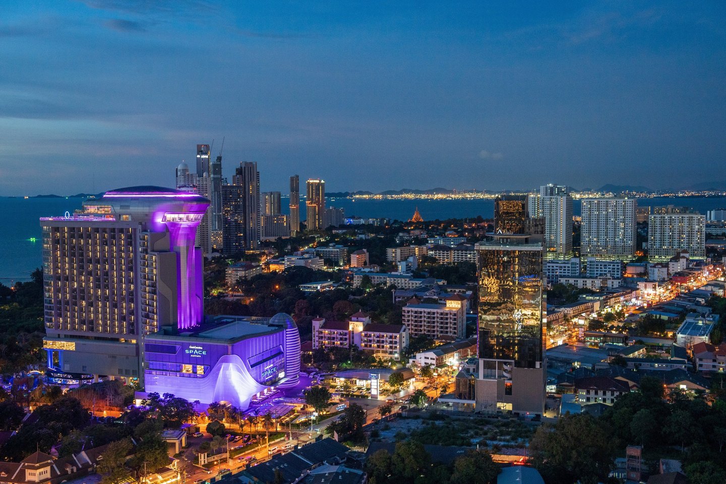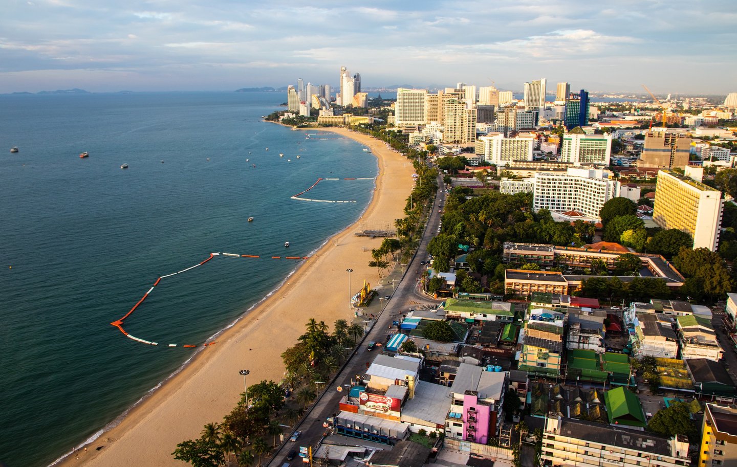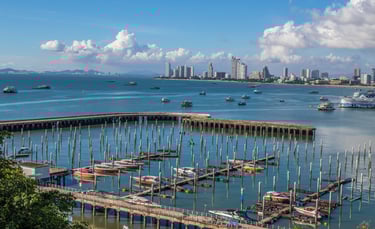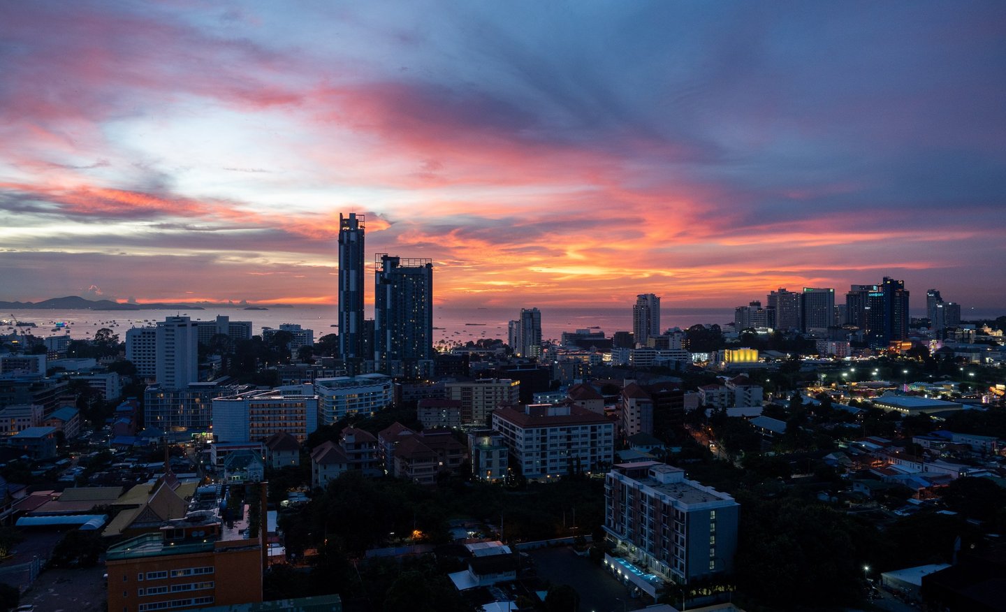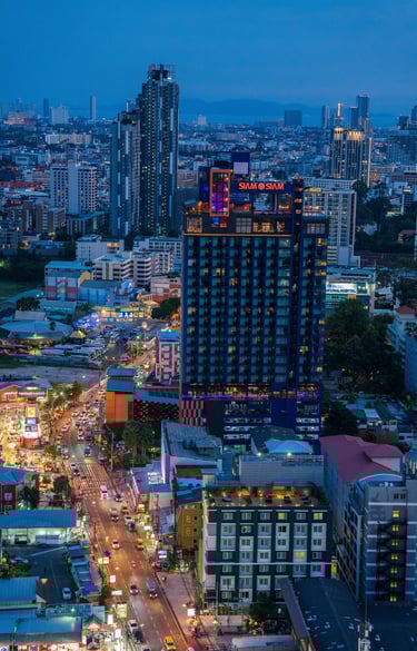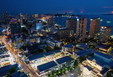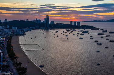 What many people see only as a nightlife destination becomes something else: a coastal city with a dynamic skyline, vibrant harbor activity, and dramatic evening light over the Gulf of Thailand.