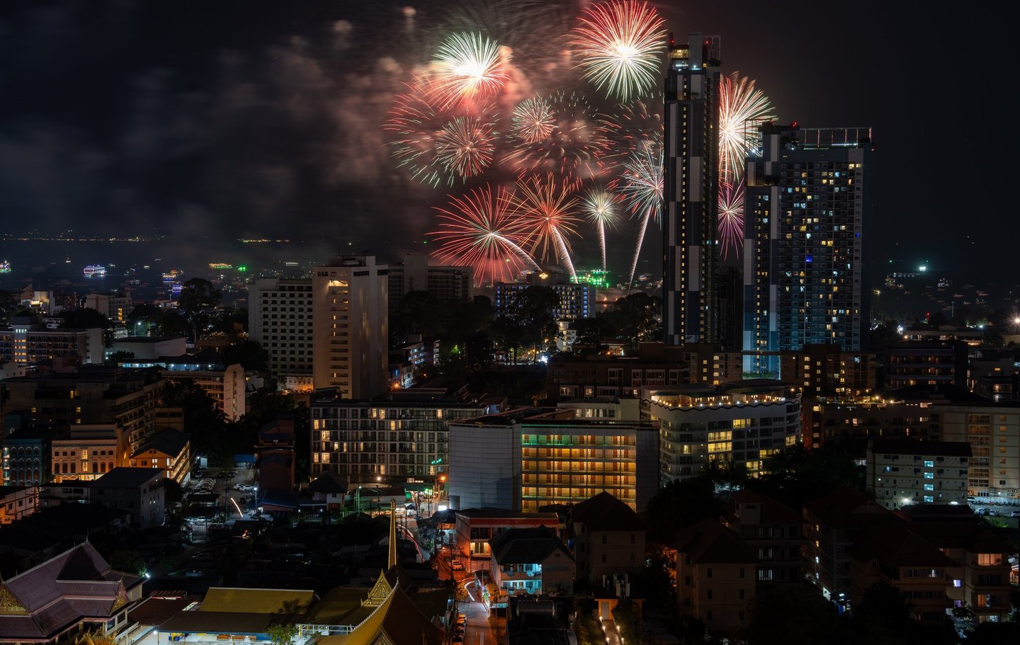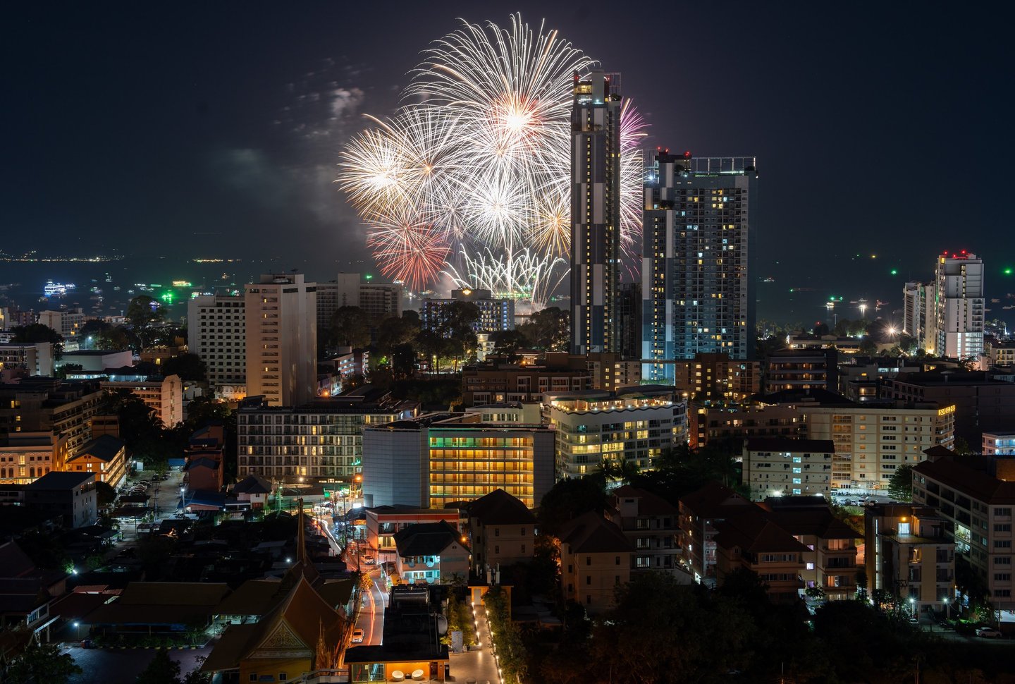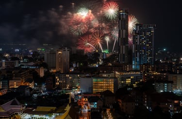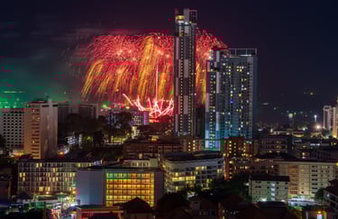 There is also another special moment during the year when this location becomes especially rewarding for photographers. During the annual Pattaya Fireworks Festival in November, the rooftop offers a fantastic vantage point for photographing the fireworks displays over the bay. From here the exploding colors appear directly above the skyline and the sea — creating dramatic long-exposure photography opportunities with the illuminated city in the foreground.