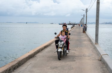 A motorbike rolls slowly toward me along the narrow path, its sound blending with the sea breeze. A mother rests in a hammock with her child, watching the soft light over the sea, while a few stray dogs wander lazily between the boats, hoping for a small piece of fish