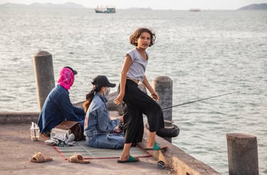 Thai families arrive to fish together as the sun sets, chatting quietly as they drop their lines into the water.