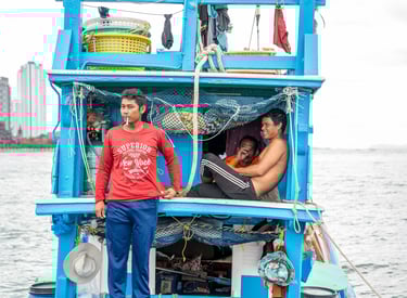 Fishermen can be seen repairing nets, cleaning their decks, or resting inside their boats — many of which serve as both workspaces and homes.
